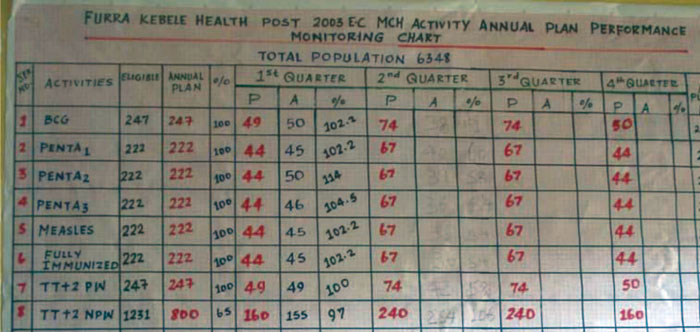Figure 10.6  Wall chart showing actual immunization coverage (number and percentage) for the first quarter of the year, and the planned targets for the remaining quarters at Fura Health Post in SNNPR. (Photo: Janet Haresnape)