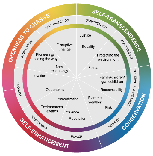 The next activity builds on the Schwartz Theory of Basic Human Values, which we introduced in Session 3 (Activity 3.2 [Tip: hold Ctrl and click a link to open it in a new tab. (Hide tip)] ). It asks you to think about the way you communicate with business owners and managers, and how to use the most appropriate language for organisations and individuals with different sets of values.
