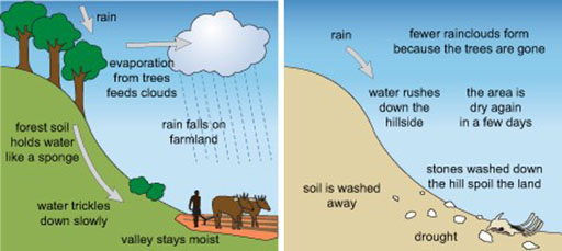 Trees help to stabilise soil. Deforestation results in soil erosion. This means food production is affected and can result in hunger and economic losses. Reservoirs and water supplies can silt up and harbours and estuaries must be continually dredged to keep them open.