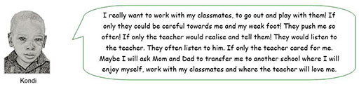 - Kondi mentions that his classmates push him while playing. As a teacher, how could you help the pupils to adopt inclusive behaviours and attitudes?