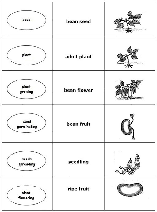 Then she divided her class into four groups: Groups 1 and 2 each had three pictures showing one of the stages in the bean’s life cycle, Group 3 had the rectangular labels (describing the pictures) and Group 4 had the round labels (describing the steps in the life cycle story). Resource 6 shows these labels and pictures.