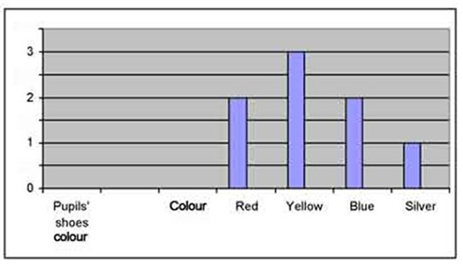 You can use the chart to find out information about each pupil by looking at each row in turn. For instance Alice’s shoes are yellow and have 6 eyelets.