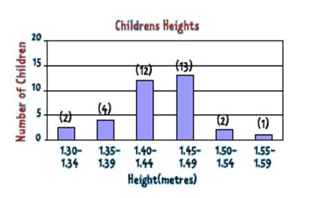This graph shows the heights of a class of children. The heights are grouped in equal intervals of 5 cm. This means that 1.30 – 1.34 includes children with heights of 1.30 m, 1.31 m, 1.32 m, 1.33 m and 1.34 m.