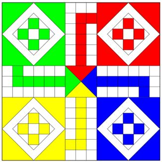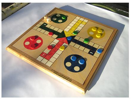 A simple children’s board game for two to four players, in which the players race their four tokens from start to finish according to the way the dice falls.