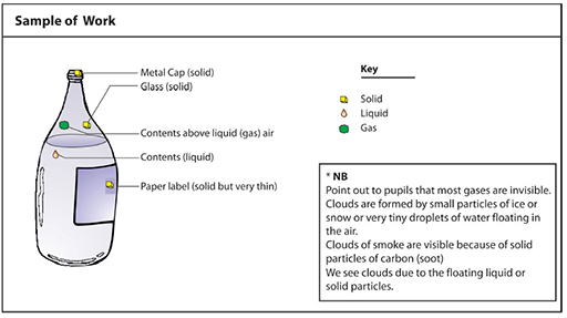 Encourage discussion and feedback from each group. How did they identify liquids? Gases? See Resource 3: Sample of pupil’s work.