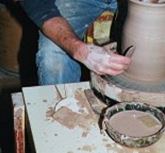When the work has dried to a leather-hard state, the pot can be trimmed. Handles are attached at this stage. Certain types of decoration can be added. Once pots are bone dry, they can be bisque-fired in a kiln. This produces a hard yet porous vessel. | Pulling a handle for a mug ![]() |