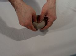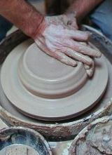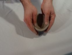 The potter, bearing down on the clay with their hands, then centres the clay. The fingers are used to first form the floor of the pot and then, to pull the walls of the clay up, typically into a cylindrical shape. Then the potter gently shapes the pot into the desired form, using the fingertips, as the wheel continues to spin. | Opening up the clay ![]() |