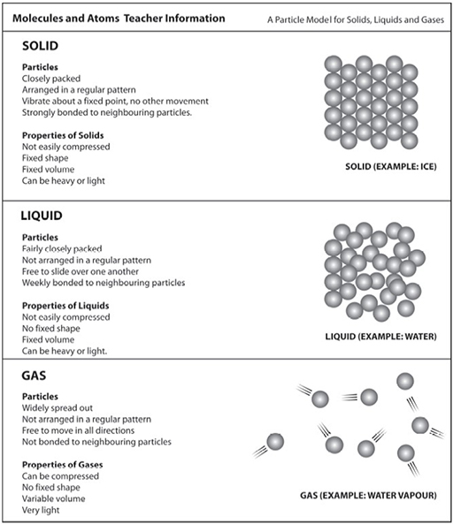 With your pupils, choose three suitable icons to use in this lesson. You will need icons to represent a solid (perhaps a picture of a block or cube – brown or black), a liquid (perhaps a droplet – blue) and a gas (perhaps a cloud of dots – grey or pencil).