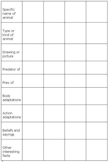 The table is built up and added to over time. Encourage your pupils to add questions to the table. If possible, use different colours for questions and answers. Blank spaces will indicate where further research is needed. You might ask different pupils to take responsibility for finding out about particular animals, but encourage teamwork. If you have a multigrade class, older pupils could assist younger pupils with the recording. You will need to plan regular times to allow pupils to add their findings to the table.