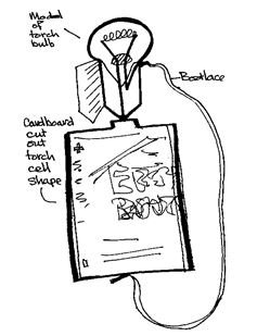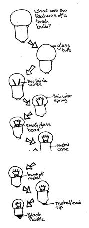 - While they do this, draw the outline of a torch bulb on the board. (Or you can have a ready prepared drawing, which you put up at this point. You can also have labels, written on cards, ready for when they tell you what they observe.)