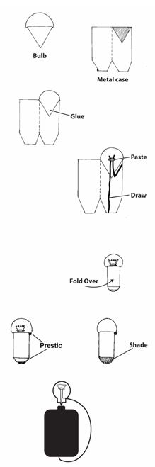 You also need to make a large 2-D (flat) model of a torch bulb for the part of the Activity where pupils observe a bulb carefully. You will also use this model when you conclude the Activity. 1.Cut out the large bulb shape. 2.Cut out the shape for the metal case of the bulb. 3.Glue the bottom of the bulb to the right side rectangle so that it fits over the shaded triangle. 4.Use a large black crayon or koki-pen to draw the thick wires, as shown. 5.Cut out a small oval bead shape from a coloured picture in a magazine and paste it over the black lines you have drawn (this represents the glass bead that prevents the two thick wires from touching). 6.Make the filament from a coil of thin wire, and fasten it across the ends of the thick black lines. One way is to stick the ends of the coil of wire through the cardboard and to use sticky tape on the wrong side (back) to fasten them down. 7.Fold the left-hand side of the base of the bulb over the right-hand side. Now your model of a torch bulb is nearly complete. 8.Use blobs of Prestic to represent the metal solder mark on the side of the case, and the bottom metal tip of the torch bulb. 9. Finally, shade the trapezium shape between the metal case and the metal tip of the torch cell. This shows the layer of black plastic that separates the metal cylinder from the metal tip. | ![]() |
