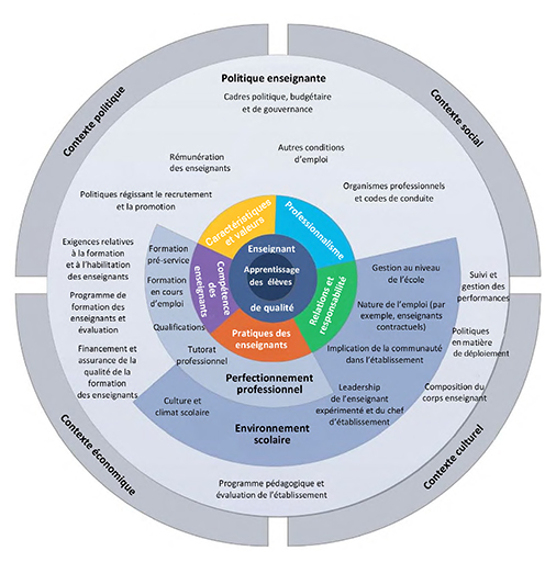 Si le chapitre se concentre sur les éléments essentiels de toute politique enseignante, ceux-ci doivent être envisagés dans le contexte d’un pays ou d’un système éducatif particulier. Certains de ces éléments ont fait l’objet de recherches et d’études approfondies, mais l’espace ici disponible ne permet pas d’analyser chacun d’entre eux d’une manière exhaustive. Ce chapitre expose les principes de base de chaque dimension, puis fournit les références à des sources plus détaillées (sous la forme de références intégrées et de liens hypertextes), afin de permettre aux utilisateurs du présent Guide de les explorer plus en détail si nécessaire. Il présente les principes de base des neuf dimensions majeures qui sont jugées cruciales pour toute politique enseignante globale :