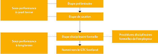 Le Cadre du General Teaching Council of Scotland (2012), qui a fait du soutien aux enseignants dont les performances sont faibles un élément central de la stratégie d’amélioration, fournit un résumé utile des procédures applicables en cas de performances insuffisantes (figure 3.2).(PDF)