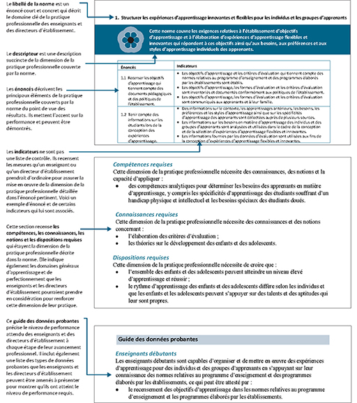Les normes sont généralement énoncées de façon claire et précise ou sous la forme d’une série de courts titres suivis de leurs définitions. Elles mentionnent très souvent tous les aspects clés de la connaissance et de la pratique de l’enseignant qui sont appliqués dans un système éducatif. La majorité des cadres normatifs renferment des éléments similaires, tels qu’une bonne connaissance de la matière, les compétences pédagogiques, une bonne connaissance des apprenants, les compétences pour planifier l’enseignement, l’évaluation de l’apprentissage de l’élève, la gestion de l’environnement d’apprentissage et la capacité à se perfectionner.