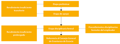 El Consejo de Enseñanza General del Marco de Escocia (2012), que incluye apoyo para los docentes con un rendimiento insuficiente como un componente clave de una estrategia de mejora, proporciona un resumen útil para abordar el rendimiento insuficiente. (PDF) [Consejo: Pulse la tecla Ctrl al hacer clic en un enlace para que se abra en una pestaña nueva (ocultar consejo)]