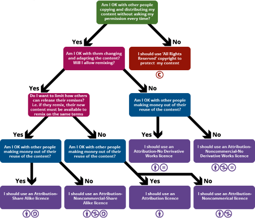 If you need some help deciding which licence might be best for you, this adapted flowchart from CC Australia might be useful – but please note that the information it contains is not legal advice. Starting at the top of the chart, the chart asks a series of questions to help you determine which CC licence would work best for your needs.