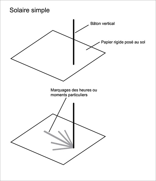 Une autre horloge à ombre égyptienne – ou cadran solaire – dont on pense qu’elle serait le premier dispositif portatif, est utilisée aux alentours de 1500 avant notre ère. Cet appareil divisait un jour ensoleillé en dix parties, plus 2 heures « intermédiaires » le matin et le soir. Quand la longue tige, portant cinq marques espacées irrégulièrement, était orientée à l’Est et à l’Ouest le matin, une barre transversale en hauteur, du côté Est, projetait une ombre mouvante au-dessus des marques. A midi, on faisait pivoter l’appareil dans la direction opposée, pour mesurer les heures de l’après-midi.