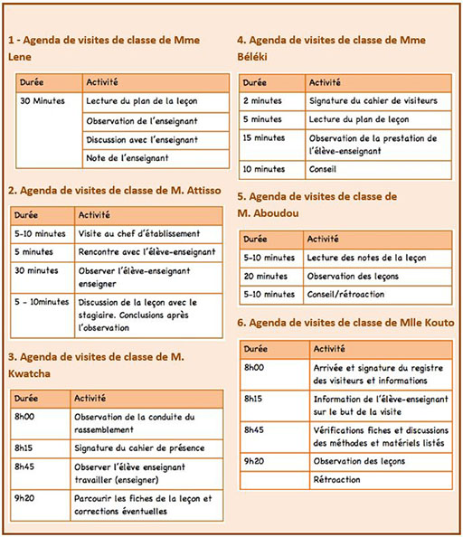 - Maintenant, regardez les agendas de visite des écoles ci-dessous. Y a-t-il quelque chose qui vous surprend? Quels conseils pourriez-vous donner à ces superviseurs pour soutenir plus efficacement les élèves-enseignants dans leurs stages en responsabilité ?