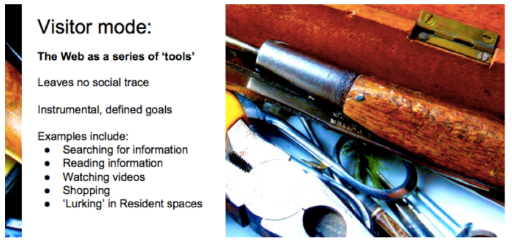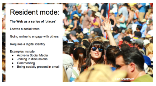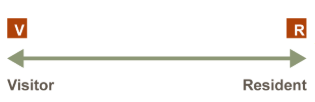 ဧည့်သည်နှင့် နေထိုင်သူ ချဉ်းကပ်မှုဆိုသည်မှာ အင်တာနက်နှင့် မိမိ၏ဆက်နွှယ်မှုကို ကိုယ်စားပြုပုံကားချပ် ရေးဆွဲမှုအပေါ် အခြေခံထားခြင်းဖြစ်သည်။ အဓိပ္ပါယ်ရှိသော နှိုင်းယှဉ်မှုများလုပ်နိုင်ပြီး နည်းပညာကျွမ်းကျင်မှုနှင့် အသက်အရွယ်ကို အခြေမခံဘဲ ဆက်စပ်ပတ်သက်ရန် လှုံ့ဆော်မှုအပေါ် အခြေခံကာ အနည်းငယ်သာ ကွဲပြားသည့် ဆက်စပ်ပတ်သက်မှုပုံစံများ ရှိသည်ဆိုသော ပကတိအခြေအနေကို ဆုပ်ကိုင်သည့် ဖွဲ့စည်းပုံတစ်ခုကို အသုံးပြုထားပါသည်။ အသုံးပြုသူကို အမျိုးအစား (၂) မျိုး (ဒေသခံနှင့် ရွှေ့ပြောင်းနေထိုင်သူ) ဟု ရိုးရိုးရှင်းရှင်း ခွဲခြားမည့်အစား ဧည့်သည်လား၊ နေထိုင်သူလား ကျွန်တော်တို့ မိမိကိုယ်ကို ခွဲခြားသတ်မှတ်နိုင်ပါသည်။ ကျွန်တော်တို့အသုံးပြုနေသည့် နည်းပညာတိုင်းအတွက် ခွဲခြားသတ်မှတ်ပါသည်။ ကျွန်တော်တို့ သွားရောက်လည်ပတ်သည့် အတိုင်းအတာအရ (အသုံးပြုပြီးနောက်တွင် မည်သည့်ခြေရာလက်ရာမှ မကျန်ရစ်ပါ)၊ နေထိုင်သည့် အတိုင်းအတာအရ (အများမြင်တွေ့နိုင်သည့် ခြေရာလက်ရာ သို့ အွန်လိုင်းပုံရိပ်တစ်ခု) ခွဲခြားသတ်မှတ်ပါသည်။