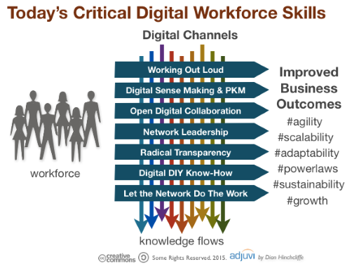 သူ၏ What Are the Required Skills for Today’s Digital Workforce? [Tip: hold Ctrl and click a link to open it in a new tab. (Hide tip)] ဆိုသည့် ဘလော့ဂ်ဆောင်းပါးတစ်ပုဒ်တွင် သူယူဆသည့် ကျွမ်းကျင်မှုများက "ကျွန်တော်တို့ရဲ့ ဒစ်ဂျစ်တယ်ခေတ်ကြီးမှာ အများကြီးပိုပြီးတော့ အရှည်တည်တံ့နိုင်ပြီး အဓိပ္ပာယ်ရှိတဲ့နည်းလမ်းနဲ့ အလုပ်လုပ်ဖို့ မရှိမဖြစ်လိုအပ်တယ်" ဟု Dion Hinchcliffe က ရေးပါသည်။ အဆိုပါကျွမ်းကျင်မှုများကို အောက်ပါပုံတွင် ဖော်ပြထားသည်။
