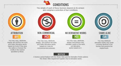 အွန်လိုင်းပေါ်ရှိအရာတစ်ခုကို အွန်လိုင်းပေါ်တွင်ရှိနေသဖြင့် လွတ်လပ်စွာသုံးစွဲခွင့်ရှိသည်ဟု များသောအားဖြင့် ထင်တတ်ကြသည်။ တကယ်ရော ဟုတ်ပါသလား။ အင်တာနက်ဝက်ဘ်ပေါ်တွင် တင်ထားသော အရင်းအမြစ်တစ်ခုကို မိမိ၏ ရှင်းလင်းတင်ပြမှု (သို့) အစီရင်ခံတွင် ယူသုံးရန် တင်ထားသူထံ ခွင့်ပြုချက် တောင်းလေ့ရှိပါသလား။ များသောအားဖြင့် တောင်းလေ့မရှိပါ။ ထို့ကြောင့် Creative Commons လိုင်စင်များ ရှိနေတာ ဖြစ်ပါသည်။ ထိုလိုင်စင်များသည် ရေးသားသူများက မူပိုင်ခွင့်ကို ထိန်းသိမ်းထားစဉ် အရင်းအမြစ်တစ်ခုကို မိမိအား မည်သို့သုံးစွဲစေချင်သည်ကို အတိအကျ သိရှိစေသည်။ FOTER ၏ How to Attribute Creative Commons Photos မှ သင့်တော်သလို ပြုပြင်ထားသော အောက်ပါပုံတွင် လိုင်စင်တစ်ခုစီ၏ ခွင့်ပြုပုံများကို လေ့လာနိုင်သည်။