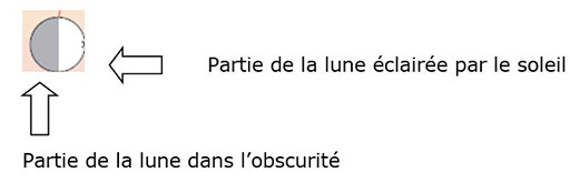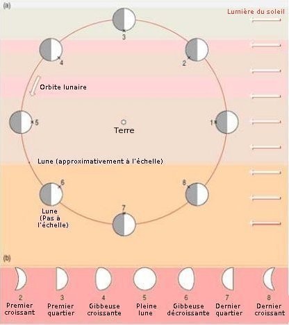 Le schéma de la page suivante vous aidera à comprendre le déplacement de la lune autour de la terre. Il montre comment on voit des quartiers de lune de tailles différentes aux différentes étapes de son orbite. Il montre comment les phases de la lune résultent de son orbite autour de la terre. Le temps entre les occurrences de la même phase (c’est-à-dire la pleine lune) est de 29,5 jours en moyenne.