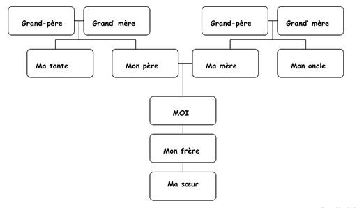 Recopiez cet arbre généalogique sur le tableau ou sur une affiche. Les enfants peuvent le recopier dans leurs cahiers, ou sur du papier-journal si vous voulez afficher leur travail. Chaque enfant doit d’abord faire une liste de toutes les personnes de sa famille qu’il veut inclure sur son arbre, puis dessiner le nombre de cases correspondant. Cela peut donc représenter plus ou moins de cases que ce qui est indiqué ici.