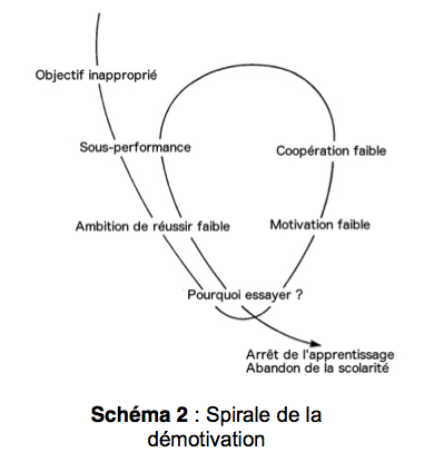 | Schéma 2 : Spirale de la démotivation | Adaptée d’une idée originale d’un des auteurs pour l’article : Deane, M. (1992) Teaching Modern Foreign Languages to Pupils with Special Educational Needs? With Pleasure! dans The Language Learning Journal, No. 6, September 1992, (p. 43-47) |