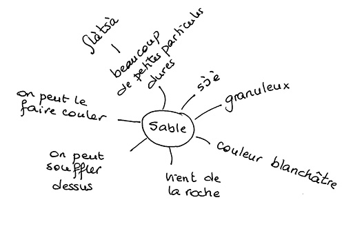 Tout d’abord, elle a demandé aux élèves de noter sur un schéma en forme d’araignée leurs observations et leurs connaissances sur le sable et voici le résultat de l’un des meilleurs groupes.