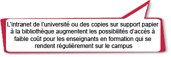 Il se peut que vous souhaitiez aider vos enseignants à trouver des ressources localement en développant un « centre ou zone de ressources » dans votre institution ou dans les centres de formation. Les enseignants pourraient emprunter le matériel pédagogique pour l’utiliser dans leur classe et partager celui qu’ils développent eux-mêmes. Ils pourraient aussi être encouragés à créer un espace ou une armoire de ressources dans leur école ou leur classe.