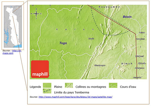 Le pays des Temberma couvre le Nord-Est de la préfecture de la Kéran (Nadoba) et Koutougou dans la préfecture de Doufelgou. Il comprend au total une vingtaine de groupements villageois. Ceux de Nadoba, les premiers villageois à s'installer sur ce site, disent venir de Dinaba près de Tanguiéta dans l'actuelle République du Bénin. Ils seraient venus en plusieurs vagues, à la recherche de nouvelles terres, à la suite d'une famine dans leur pays d'origine et se sont installés dans cette région de terres arables (ou cultivables) et de forêts, entre les rivières Keran et Binah réputées poissonneuses.
