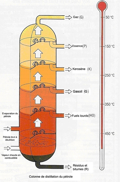 | Résidus (R) | Goudron pour enrober des routes, matériaux étanches pour toitures, combustibles pour centrales électriques. |