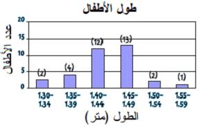 المدرج التكراري الإحصائي الجدول يبين المعلومات حول مجموعة من البيانات. لكثرة عدد البيانات أحيانا، الوسيلة الوحيدة لإظهارها كلها هي تقسيمها إلى فئات. هذا الرسم البياني يظهر الأطوال لدى فصل أولاد صغار. الأطوال مقسمة إلى فئات متساوية الطول أي 5 سم. هذا يعني أن 1.30-1.34 يشمل الأولاد ذوي الأطوال 1.30م، 1.31م، 1.32م، 1.33م و 1.34م. كم عدد الأطفال الذين طولهم ما بين 1.45 و 1.49؟ |