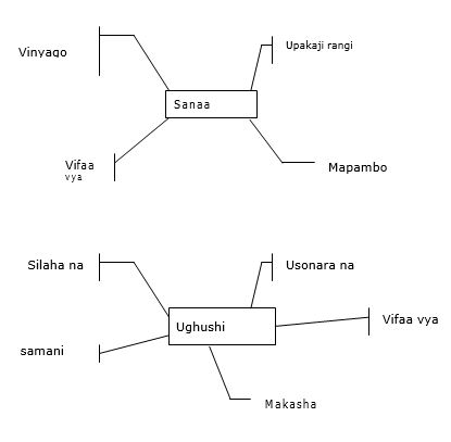 michoro mbalimbali, silaha, vifaa vya nyumbani na vishirikishi. Bi. Kabalimu aliligawa darasa katika makundi madogo (angalia Nyenzo rejea ya muhimu: Kutumia makundi darasani kwako ) na kulipa kila kundi majina ya vitu viwili vya sanaa na maswali yafuatayo: