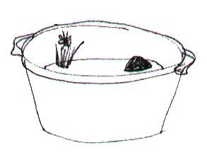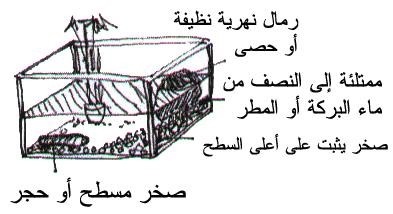 ضع طبقة من حصى النهر النظيف أو الرمل وكذلك حجارة قليلة مسطحة . أضف قليل من طين بركة جديد .