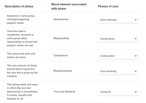 Below are the phases of care developed by Fisher and Tronto (1990, pp. 40, cited in Tronto (2013 pp. 22)) and the five moral elements of care (see also Collett et al., 2018).