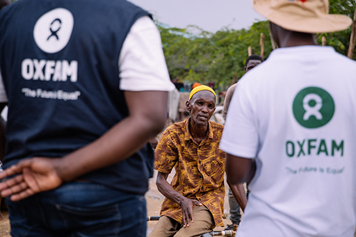 Miembros del personal humanitario de Oxfam hablan con Abdalla Dullow, integrante de la comunidad desplazada por las inundaciones en la localidad de Baraka, del condado de Garissa (Kenia).