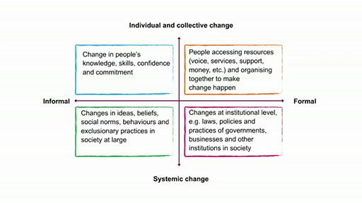 أُتيحت لك الفرصة في هذه الوحدة للتفكير في كيفية حدوث التغيير على مستويات مختلفة، في المجالات الرسمية وغير الرسمية، وداخل الأفراد، وفي الأنظمة (المؤسسات والحكومات والسياسات والممارسات). لقد ساعدتنا أداة تحليل التغيير في البحث بشكل مختلف في مجموعة من قصص التغيير من جميع أنحاء العالم.