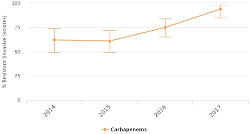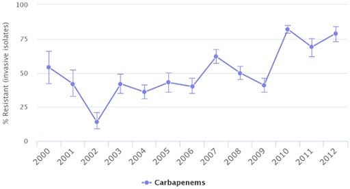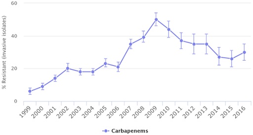 In Figure 2 you see the resistance that Acinetobacter baumannii has developed against a class of antibiotic known as carbapenems as documented by the One Health Trust (OHT). The percentage of resistant isolates of Acinetobacter baumannii is indicated in blue; the darker the country, the higher the percentage of resistance. There are no data available on the countries in light grey.