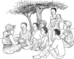 Questionnaires are a list of questions with a space under each one for the researcher to write the answers given by the respondent (the person ‘responding’ to the questionnaire). Alternatively, questionnaires can have several possible answers to each question and the respondent chooses which one best represents their status, knowledge or opinions. Interviews are less formal and the interviewer has a structured conversation with one or more respondents about topics of interest, and writes down the answers based on what the respondent says. Focus groups are guided discussions in a group of people who have agreed to ‘focus’ on a particular subject, sharing their views and experiences in order to shed light on a problem and its possible solutions. The group has a facilitator, who keeps the group focused on the agreed topic and records the points made in the discussion (Figure 10.6). You will learn more about these (and other) data collection methods in Study Session 12.