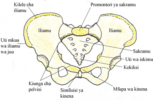 Kitokezi cha pelvisi kimeundwa kwa mpaka wa chini wa mifupa ya kinena upande wa mbele na mpaka wa chini wa sakramu upande wa nyuma. Nyuti za iskiamu zimechomoza kuelekea pande zote mbili. Mchoro 6.4 kinaonyesha ukubwa wa nafasi ambayo ni sharti fetasi kupitia inapotoka katika pelvisi la mama. Unapotazama Mchoro 6.4, chukulia kuwa wewe ni mkunga anayetazama juu katika njia ya uzazi huku ukingonjea fetasi ichomoze kichwa.