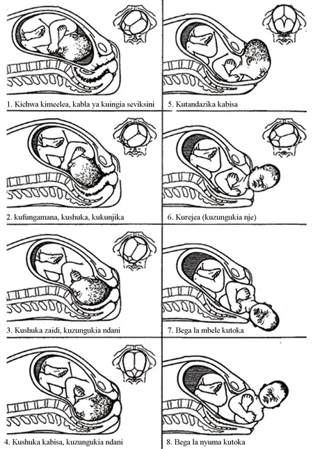 Miendo saba mikuu ni mabadiliko ya hali ya mtoto, ambayo yeye hufanya ili kuweza kushukia kwenye njia ya uzazi. (Neno ‘mikuu’ humaanisha ”muhimu sana”). Hali ya mtoto kabla ya miendo kuanza imeonyeshwa katika Mchoro 1.3 (mchoro wa 1) na miendo yote saba imeonyeshwa katika michoro ya 2-8. Unaposoma maagizo yanayofuatia, tazama Mchoro 1.3 tena.