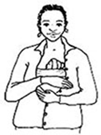 Hipothemia hufasiliwa kama kiwango cha jotomwili cha nyusi 35.5 au zaidi, ingawa kiwango hiki ni cha chini sana na hatari kwa mtoto mchanga. Iwapo mtoto ana baridi, usigonje kiwangojoto kishuke hadi chini ya nyusi 36.5 kabla ya kuchukua hatua ya dharura ili kumpasha joto. Mvue nguo kisha umweke huku mwili wake ukiguzana na wa mama, katikati ya matiti akiwa amefunikwa kwa nguo. (Mchoro 6.3) Mfunike mama na mtoto kwa blanketi, huku ukifunika kichwa cha mtoto kwa chepeo au kijiblanketi. Iwapo mtoto hajavishwa sokisi, ifunike miguu yake (hii hujulikana kama Utunzaji wa Mama wa aina ya Kangaruu, kama utakavyojifunza katika Kipindi cha 8.) Iwapo kiwango cha jotomwili cha mtoto hakianzi kupanda hadi kile cha kawaida baada ya dakika 30, au ki chini ya nyusi 35.5, au midomo ya mtoto ni ya rangi ya samawati, mpeleke mtoto rufaa mara moja.