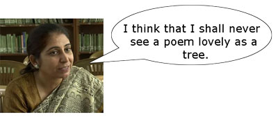 I tried asking my students some simple questions about their lives, but they couldn’t answer me. So I realised that I had to start at the beginning. The best way that I could think of to get them used to practise speaking English was by reading out loud. The easiest texts to use are from lessons from the text book, so I decided to make a start with the very next lesson – a poem from Chapter 8 of the NCERT Class IX textbook Beehive: ‘Trees’, by Joyce Kilmer: