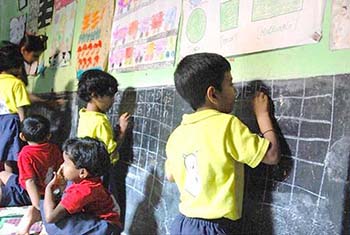 You can compare new names to the names already on the wall. For instance, is the ‘i’ at the end of Chunni's name different from or similar to the ‘i’ at the end of ‘Kadambari’? In this way, students have their first lessons in letter, sound and spelling patterns.