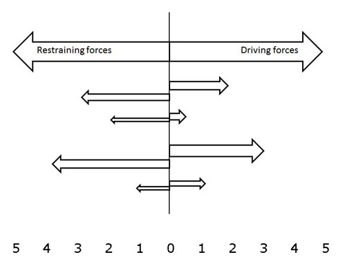 Another theory of change is ‘force field analysis’. This approach to change encourages you to focus on the conditions that are already in place that will firstly support the change and secondly identify the likely sources of resistance.
