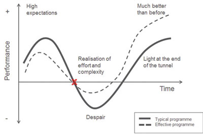 At the start of the change process there is often enthusiasm, interest and optimism, leading to an improvement in performance for many. As the change is understood and the recognition of all the complexities in performance grows, confidence can drop and performance levels fall in what is known as the ‘dip’. This is normal, but the leader can do much to ensure that this dip is neither too deep nor too long-lasting.