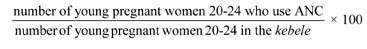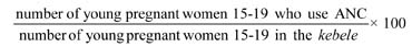 If we want to calculate ANC coverage among young pregnant women aged 15–19 years we divide the total number of young pregnant women aged 15–19 years who use ANC by the total number of young pregnant women aged 15–19 years in the kebele and multiply by 100.