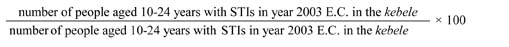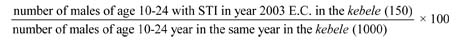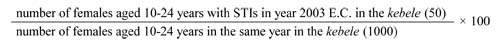 In 2003 E.C. the total number of young people aged 10-24 years in a kebele whose total population is 6,000 was about one third of the total population. Females constitute half of the young people of age 10-24 years. From the same year, you have data showing that the total number of young people aged 10-24 years in the kebele who were treated for STIs was 200 out of which 50 were female.