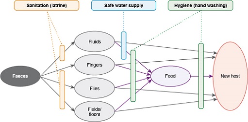 There are several different pathways or transmission routes, from faeces to host that are shown in Figure 1.3. This is a pictorial representation of how disease-causing agents spread from faeces through water, food or soil to another person. It is known as the ‘F diagram’ because the main elements all begin with the letter ‘F’, i.e. faeces, fluid, fingers, flies, fields and food. In each transmission route, the infection passes from faeces on the left through to the new host on the right. This is faecal-oral transmission of disease, meaning the infection passes from faeces to mouth (oral is from the Latin for mouth).